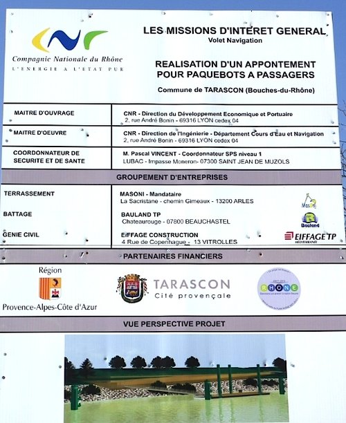 Une nouvelle escale pour bateaux de croisière est en cours de finition à Tarascon (*). Sur la rive gauche du Rhône, à un kilomètre environ en amont du superbe Château du Roy René, ce ponton flottant doit permettre aux croisiéristes de débarquer/embarquer confortablement leurs passagers. Une voie d'accès aux autocars ainsi qu'un vaste parking viennent compléter ce judicieux aménagement, hélas destiné aux seuls bateaux à passagers. Mais on reparle d'un projet de port pour la plaisance... ....
