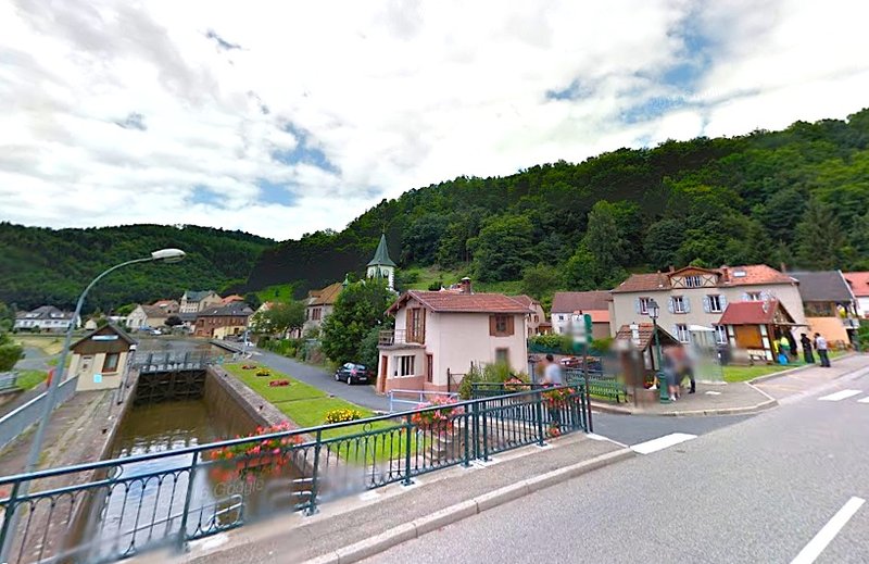 (**) NOTE => En cliquant sur la photo ci-dessus, vous rejoindrez notre outil de calcul d'itinéraires fluviaux, Fluviacap. une vue aérienne apparaît en surplomb du pont de Lutzelbourg sur lequel l'ancre du PKouchnok a été déposée. La nouvelle épicerie-tabac est séparée de la maison éclusière par un parking. Après avoir cliqué sur le bouton "Street View", vous pourrez remonter la rue de Phalsbourg, passer la barraque à frites et rencontrer une première maison (en vente au moment de la prise de vue par Coogle-Street-View). C'est dans ce grand bâtiment que Céline et Jean-Marc Gruss ouvrent, vendredi, leur nouveau magasin...