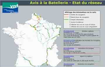 L'internaute peut consulter sur cette carte l'état du réseau en temps réel (mise à jour toutes les 3 heures) et tous les "avis à la batellerie" (chômages, travaux, incidents, horaires de navigation, appels à vigilance, réglementation, etc...