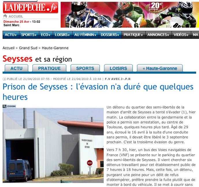 En revanche, la belle du prisonnier de Seysses est une première pour VNF. Le détenu a préféré prendre la fuite plutôt que monter à bord du bus de VNF. Le bus qui, chaque matin, vient chercher la demi-douzaine de prisonniers en semi-liberté qui travaillent pour l'établissement public.