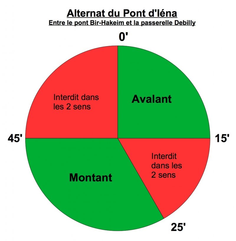 Les feux d'alternat seront positionnés, pour les montants, sur le pont de Bir Hakeim (Bras de Grenelle et Bras de Passy); et, pour les avalants, sur la passerelle Debilly. Les bateaux en attente pourront stationner en aval, dans le bras de Passy, et, en amont, au port du gros Caillou (rive gauche).