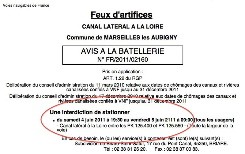 Rectificatif (bien sûr) => La Subdivision VNF de Briare - Saint-Satur vient d'apporter un correctif à son premier Avis. L'Avis à la batellerie n°FR/2011/02166 annule et remplace cet Avis n°FR/2011/02160. Le stationnement ne sera interdit qu'une seule nuit, du samedi 4 juin à 19h30 au dimanche 5 juin à 9h, entre les deux écluses de Marseilles-les-Aubigny (du PK125,4 au PK125,55)... À vrai dire, on s'en doutait un peu !